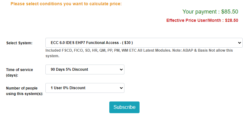 이용할 시스템에 따라 가격이 달라집니다. ECC 6.0 과 S/4 HANA 그리고 산업 특화 시스템들도 선택할 수 있는데요. ABAP 편집 기능 포함 여부에 따라서도 가격이 달라지게 됩니다. 저는 MM 컨설턴트이기 때문에 원하는 모듈을 사용할 수 있는 시스템 중 가장 저렴한 ECC 6.0 IDES EHP7 Functional Access 를 선택 하였습니다.
