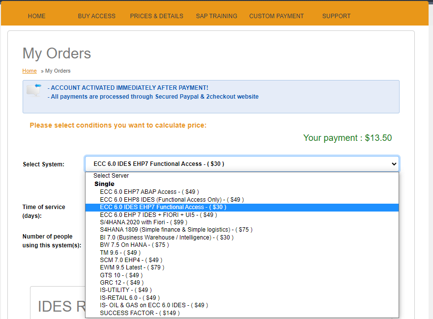 이용할 시스템에 따라 가격이 달라집니다. ECC 6.0 과 S/4 HANA 그리고 산업 특화 시스템들도 선택할 수 있는데요. ABAP 편집 기능 포함 여부에 따라서도 가격이 달라지게 됩니다. 저는 MM 컨설턴트이기 때문에 원하는 모듈을 사용할 수 있는 시스템 중 가장 저렴한 ECC 6.0 IDES EHP7 Functional Access 를 선택 하였습니다.