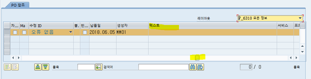 연필+처리 버튼 누르면 송장 화면으로 이동되고, 여기서 열 넓이 조정이나 순서 조정을 한 후 Enter 누르면 아래 팝업이 뜹니다. 열 순서 채택, 열 너비 채택이 활성화 되며 체크하고 저장하면 다음에 MIRO 나 MIR4 화면에서 적용된 레이아웃을 확인할 수 있습니다.