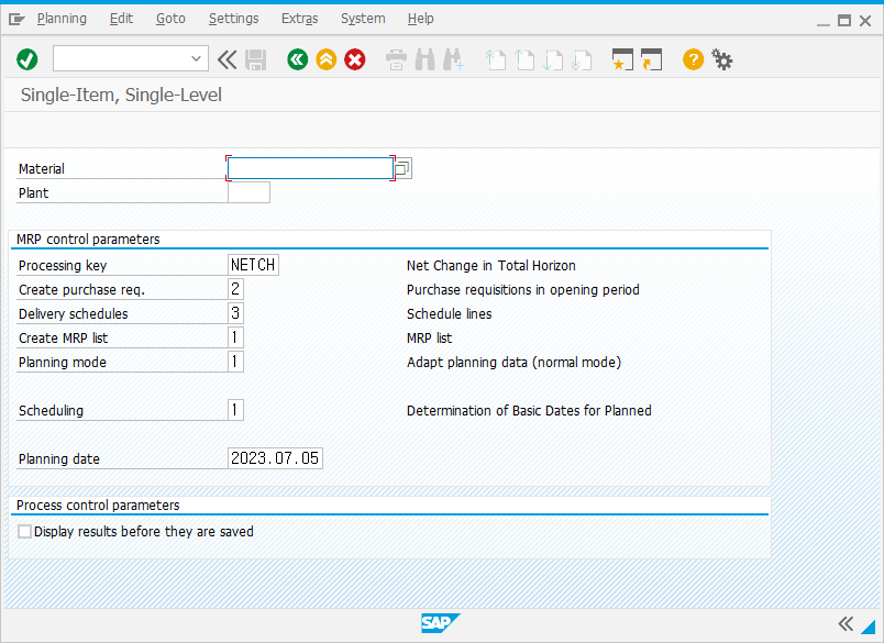 - NETPL - Net Change in Planning Horizon // NETCH 와 마찬가지로 MRP를 수행해야 하는 상황인 자재를 대상으로 하고 Planning Horizon 기간 내에 소요량을 고려하여 MRP 를 수행하는 방법 입니다. (planning horizon 은 OMDX 나 OPPQ 에서 IMG 설정 가능) 만약 Planning horizon 이 2년인데, 3년 뒤에 소요량이 있으면 해당 소요량은 MRP 에 고려되지 않게 되는거죠. 고려하려면 NETCH 로 수행해야 하고요.
